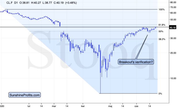 At the moment of writing these words, crude oil is attempting to break above the previous highs after verifying the breakout above the 50% Fibonacci Retracement level. It also bounced off the mid-March highs and the lower border of the price gap, in which it’s currently trading.