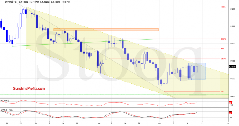 Summing up the Alert, the euro keeps trading inside its recent consolidation, and the buy signals support a test of the formation’s upper border, or even of the recent high and the 38.2% Fibonacci retracement. Should the buyers show weakness there, we’ll consider opening short positions. USD/CHF has reversed at the pink resistance zone and the upper border of the rising green trend channel, and the short position remains justified. Should USD/JPY invalidate its breakout above the upper border of the declining grey trend channel, we’ll consider opening short positions. Should USD/CAD close today or one of the following sessions below the upper border of its consolidation, we’ll consider opening short positions. Apart from these, there're no other opportunities worth acting upon in the currencies. As always, we'll keep you - our subscribers – informed.