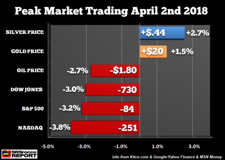 As the BLOOD continues to run on Wall Street, gold and silver were the few trading in the green today.  As I have mentioned in past articles and interviews, investors need to get used to this sort of trading activity.  Even though the Dow Jones Index ended off its lows of the day, it shed another 458 points while the Nasdaq declined 190 points and the S&P fell 60.