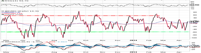 The heading of the previous newsletter warned about a short-term low. This week’s says that we should expect a minor correction, probably starting on Monday. The fifty-point rally (which may have peaked on Friday) was the result of an oversold market and a bullish background: good economic reports, a speech by the Fed chair, a lessening of tension in Ukraine, and options expiration week. This bullish potpouri will not repeat itself this week and indicators are saying that we could experience a short-term top on Monday. “Minor” is a guesstimate based on the cyclic background for the next couple of weeks which should keep the market buoyant overall for that time period. After that, there is a good chance that the decline will resume.