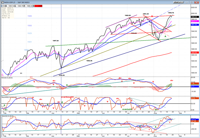 The Daily SPX (chart courtesy of QCharts.com) moved from support to resistance with very little hesitation. The smaller red channel turned out to be more accurate at determining the end of the correction once prices came out of it, but our focus should now be on where we are in the uptrend that started at 1905. The SPX was stopped by the top resistance line, but for how long? Ideally, we have started a correction of three or four days which will retrace to the level of the pink MA (at least) before extending its uptrend. But a slightly higher high cannot be discounted first! Ravenous bulls may be ready to send prices higher right away.