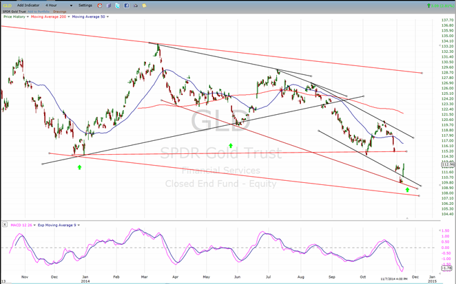 GLD dropped down to its red channel line and rallied sharply for the first time in three weeks. This suggests that the 25-wk cycle might have made its low a little early. If so, a re-test of the low may take place before any further attempt at rallying. This rally should not be considered an important turn in the current long-term downtrend.