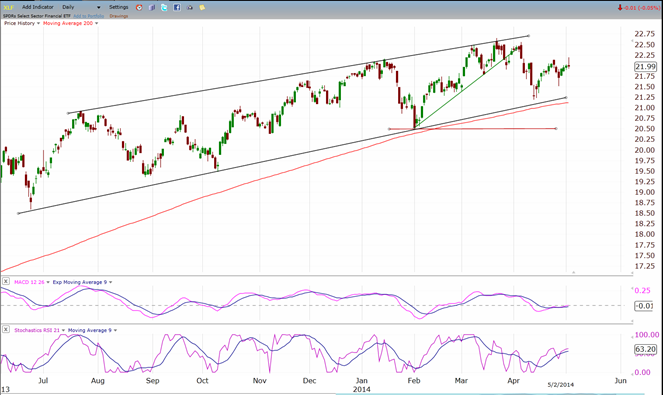 XLF continues to lag behind SPX and appears to be making a pattern which is almost ready to continue the decline that started in March.
