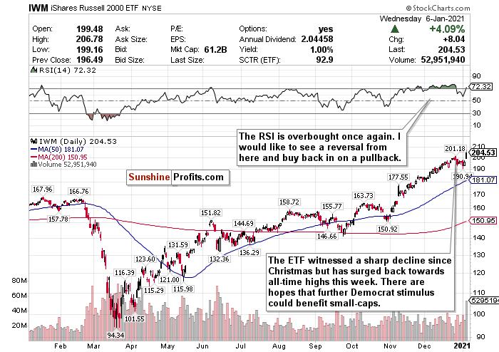 I love small-cap stocks in the long-term, especially as the world reopens. A Democrat-dominated Congress could help these stocks too. But I believe that in the short-term, the index, by any measurement, has simply overheated. Before Jan. 4, the RSI for the I WM Russell 2000 ETF was at an astronomical 74.54. I called a pullback happening in the short-term due to this RSI, and it happened. Well now the RSI is back above 72, and I believe that a bigger correction in the near-term could be imminent.