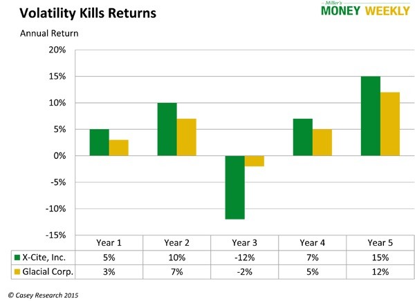 So instead let’s imagine two fictional companies: X-Cite, Inc., an amusement-park operator with a volatile stock price that adventurous investors love; and Glacial Corp., a dull, defensive sloth of a corporation whose stock returns are consistent but often lower than those of its more glamorous counterpart.