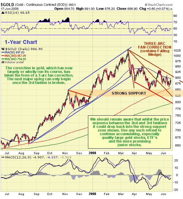 Although gold has remained in the doldrums since the last update, there is plenty of evidence that another strong uptrend is solely a question of when, not if. On the 1-year chart we can see that the reactive phase in force from mid-March is taking the form of 3-arc Fan Correction that is now believed to be quite close to completion. These fan patterns typically start out with a steep, panicky selloff as intermediate traders realize that the game of over for the time being and hit the exits. This is normally followed by a significant bounce and then by a more measured decline that frequently wreaks the most damage because it drags on for alot longer, although that was not the case here. Then, after another bounce renewed decline sets in, but this time there is little selling pressure behind it, and this downleg frequently terminates only a little below the 2nd drop and sometimes at or above it, which is a sign of strength. This is what may well be happening with both gold and silver right now. Currently gold is trading between the 2nd and 3rd fanlines of the pattern that portends an eventual upside breakout. Although the fanlines and falling 50-day moving average are clearly shepherding the price lower, the strong underlying support and rising 200 and 300-day moving averages not far beneath are expected to result in the long-term uptrend reasserting itself in due course, leading to an upside breakout and a major new uptrend. We had earlier classified the reaction from March as a bullish Falling Wedge, and this interpretation remains valid as the Wedge exists simultaneously with the Fan Correction, the price having broken out upside from the Wedge in the middle of May, and then reacted back close to the top line of the Wedge, which happens to be the 2nd fanline at the same time.