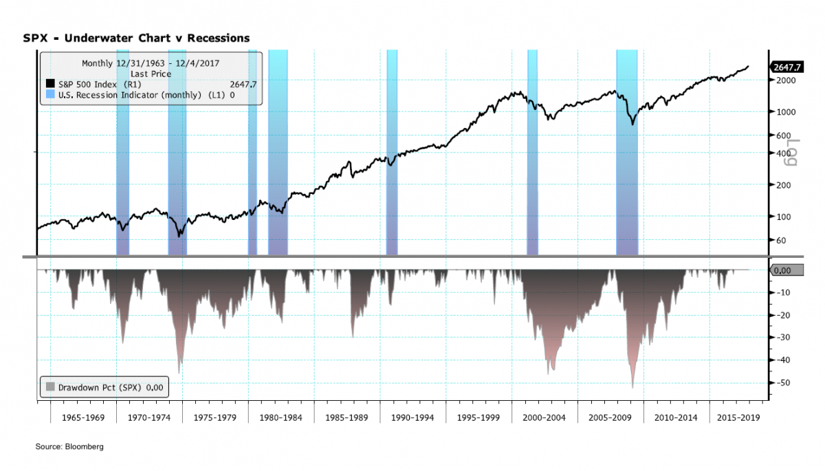 Without a doubt, equities have had an extra-ordinary run. There is the view that, without a recession, you cannot have a bear market. In our analysis, that’s true for the most part – but is “for the most part” good enough? The notable exception is the Crash of 1987 where a bear market was not accompanied by a recession. In today’s context, the buy-the-dip crowd will remind you that the ’87 crash was, well, a buying opportunity. As such, if you are an asset manager interested in keeping your job, you buy. It reminds of the 1980s where buying IBM office equipment was the sure way to keep your job, as no one would question your choice. Here’s a chart that shows the S&P 500 with the percent drawdown from any peak, with recessions shaded: