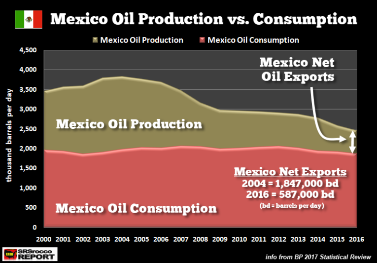 While Mexico’s oil production declined from a peak in 2004, its domestic consumption has remained basically flat. Which means, Mexico’s net oil exports have fallen by more than two-thirds in just 12 years. Unfortunately, it looks like Mexico’s oil production will be down another 10% in 2017.