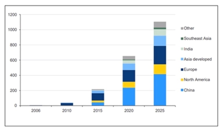 SI estimates the sector’s demand for silver will rise to 88Moz in five years as the transition from traditional cars and trucks to EVs accelerates. Others estimate that by 2040, electric vehicles could demand nearly half of annual silver supply.