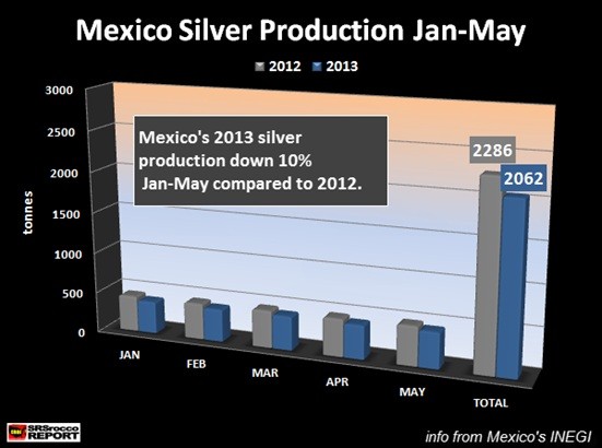 The largest silver producing country in the world has seen its production decline substantially in the first five months of the year. Mexico was forecasted to increase its silver production this year, however if present trends continue, total output could fall nearly 10% in 2013.