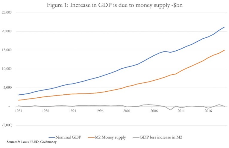Figure 1 illustrates the relationship between GDP and the money supply by comparing the increase in GDP from its base level in 1980 to end-2019 with the increase in broad money, M2, and by deriving the difference between them. And it can be seen that over the long run the difference between the two, the third line which wobbles about zero, is insignificant.
