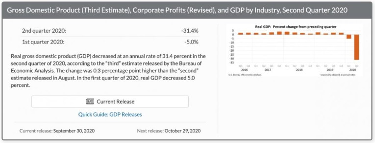 It proves you cannot measure economic progress, only the amount of money used in transactions. The relevance to today’s events is that since last March, the quantity of money has been suddenly increased by the Fed, raising the issue posed at the beginning of this article. How will the GDP numbers be affected by massive money-printing? We know from Say’s law, that those of us still exchanging our production for the goods and services we need and want, will continue to do so. But given the destabilisation of covid-19 lockdowns, trade tariffs, and the desire of banks to reduce their over-geared balance sheets, the global economy is in a deep slump. The screenshot below, taken from America’s Bureau of Economic Analysis website shows the position in America.