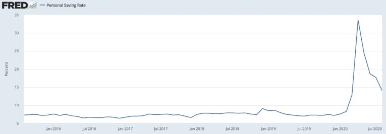 One answer put forward is that the savings rate has jumped, as illustrated in the chart from the St Louis Fed’s FRED service.