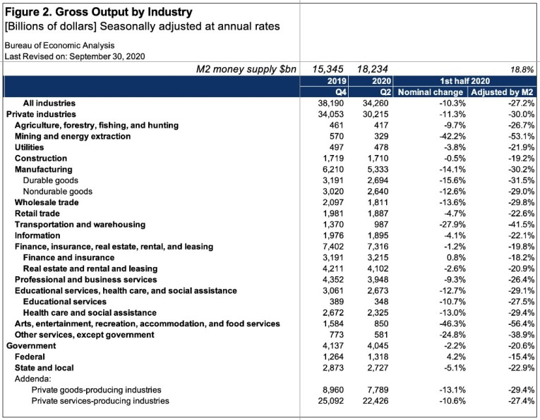 Important caveats are that the increase in M2 is assumed to apply in its entirety to GDP constituents, which is obviously not the case as long as there is spending not included, and that it applies evenly across gross output sectors, which is also not the case. But the adjustment for the increase in M2 money does serve to point out an overall effect, which would otherwise be ignored.