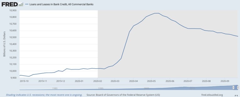 Not only will the Fed need to support supply chains, but it will have to make up for any contraction of bank credit, so it is not just a matter of filling a monetary gap. Loans to businesses are already contracting as the screenshot below shows.
