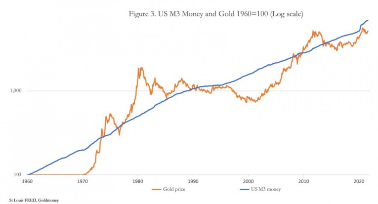 Since 1960 (the indexed base of the chart) above-ground gold stocks have increased from 62,475 tonnes by about 200% to 189,000 tonnes — offset to a large degree by world population growth.[iv] M3 broad money has increased by 70 times, the disparity in these rates of increase being adjusted by the increase in the dollar price of money, with the dollar losing 98% of its purchasing power relative to gold. By basing the chart on 1960 much of the currency expansion which led to the collapse of the London gold pool in the mid-1960s is captured, illustrating the strains in the relationship that led to the Nixon shock.