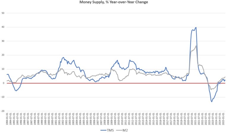 Following the big swings experienced during 2023 and 2024, money supply growth over the past nine months has settled into an upward trend with monthly growth, on average, of 1.8 percent. During that time, the total increase in the money supply has been 1.0 percent. Looking at month-to-month changes in the money supply, we also find a moderate upward trend. The money supply grew 0.6 percent from March to April. Over the past year, the money supply has increased, month over month during eight of the twelve months: