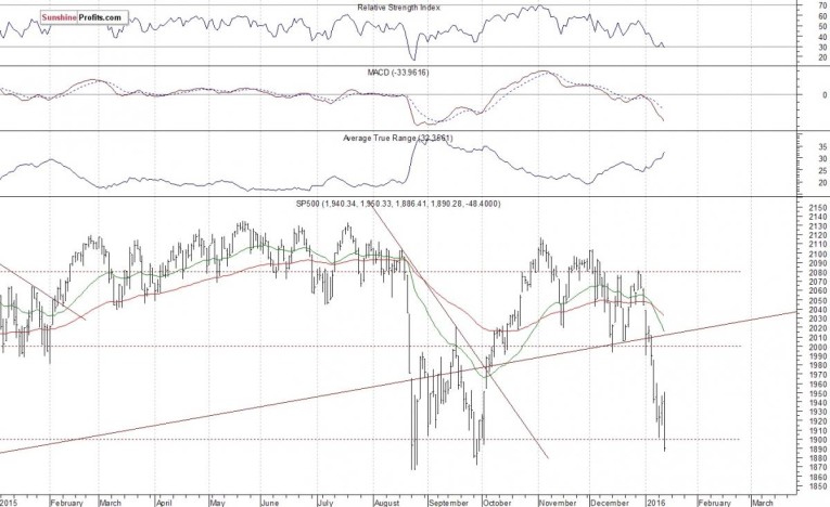 The U.S. stock market indexes lost between 2.2% and 3.5% on Wednesday, extending their short-term downtrend, as investors reacted to oil prices decline, economic data releases, among others. The S&P 500 index broke below the level of 1,900 and got closer to its last year's August - September lows. The nearest important level of support is at around 1,870, marked by those local lows. On the other hand, resistance level is at 1,900-1,920, and the next important level of resistance is at around 1,950, marked by yesterday's local high. There have been no confirmed positive signals so far. However, we can see technical oversold conditions accompanied by an increased short-term volatility, which may lead to an upward correction or downtrend reversal at some point. The market trades within last year's volatile consolidation along 1,900-2,000. Will it break below and extend its medium-term downtrend? Overall, the downward momentum remains strong, as we can see on the daily chart:
