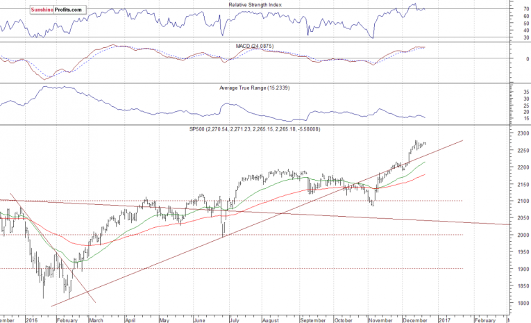 Concluding, the broad stock market remains relatively close to its all-time high, as the S&P 500 index continues to trade above 2,250 mark. However, we still can see medium-term overbought conditions. Therefore, we continue to maintain our speculative short position (opened on December 14 at 2,268.35 - opening price of the S&P 500 index). Stop-loss level is at 2,330 and potential profit target is at 2,150 (S&P 500 index). You can trade S&P 500 index using futures contracts (S&P 500 futures contract - SP, E-mini S&P 500 futures contract - ES) or an ETF like the SPDR S&P 500 ETF - SPY. It is always important to set some exit price level in case some events cause the price to move in the unlikely direction. Having safety measures in place helps limit potential losses while letting the gains grow.