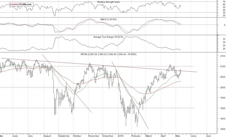 The US stock market indexes lost 0.9-1.2% on Wednesday, retracing their Tuesday's move up, as investors continued to hesitate. The S&P500 index extends its consolidation following February - April rally. The nearest important level of support is at around 2,050, and the next support level is at 2,030-2,040, marked by previous local lows. On the other hand, resistance level is at 2,080-2,085, marked by recent local highs. The next important level of resistance remains at 2,100-2,110, marked by late April highs. Last year's highs along the level of 2,100 continue to act as medium-term resistance level. Will the market break above these highs and continue its seven-year long bull market?