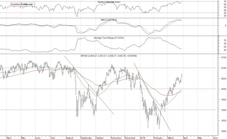 The U.S. stock market indexes gained 0.4-0.5% on Wednesday, extending their recent uptrend, as investors' sentiment remained bullish following Tuesday's Janet Yellen's speech, economic data releases. The S&P 500 index broke above its last week's local high of 2,056.60. It got closer to last year's November - December local highs along the level of 2,100. The nearest important level of resistance is at around 2,070-2,080, marked by the late December local high of 2,081.56. The next resistance level is at 2,100-2,120, marked by previous medium-term highs. On the other hand, the support level is at 2,055-2,060, marked by yesterday's daily gap up. The next support level remains at 2,000, marked by the previous level of resistance. There have been no confirmed negative signals so far. However, we can see some technical overbought conditions. The index continues to trade within a slightly descending medium-term trading channel, as the daily chart shows: