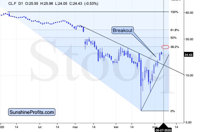 Given the strength with which crude oil broke above the declining resistance line and the fact that crude oil opened with a bullish gap yesterday, the next very short-term move will very likely be to the upside. The next particularly strong resistance level is based on the 38.2% Fibonacci retracement level and the April highs – at about $30.