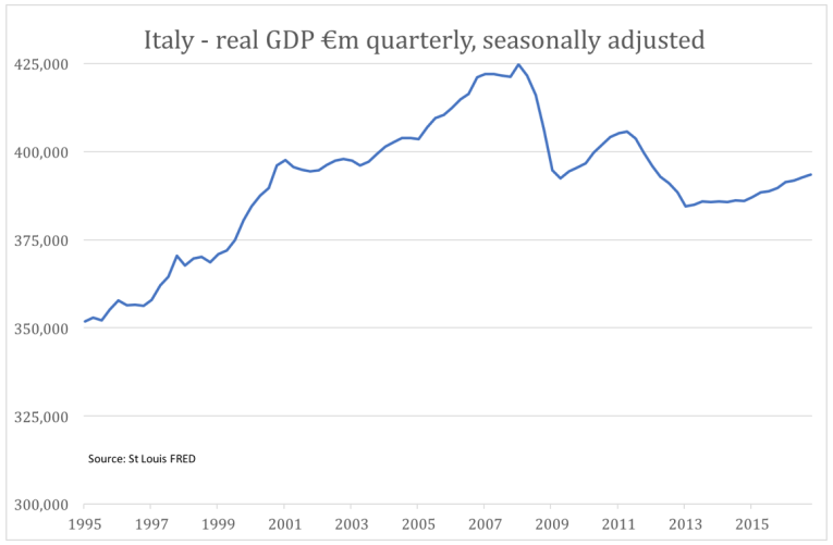 GDP is today’s standard measure of economic performance, and it shows that the volume of consumer transactions in Italy today is well below the record achieved in 2008, before the financial crisis. That’s still down over 7% after eight years.