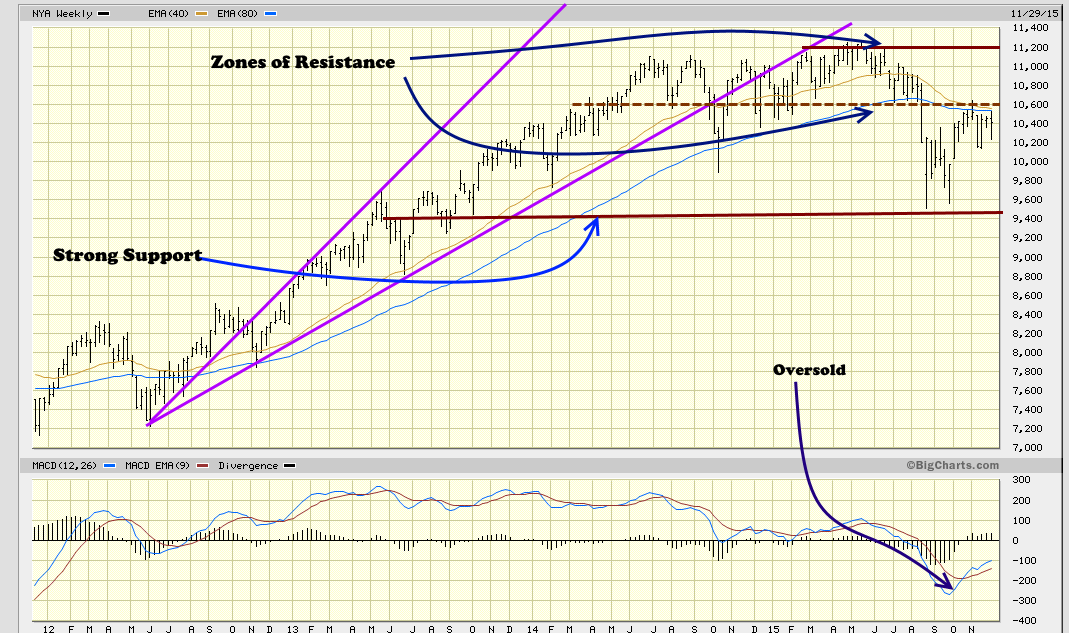 The inability of the NYSE to trade above 10,700 on weekly basis, suggests further downside testing and a possible retest of the October lows. The NYSE is building momentum to take out the 11,200 ranges and eventually put in a series of new highs. Overall the expectation is for the NYSE to be trading higher next year.
