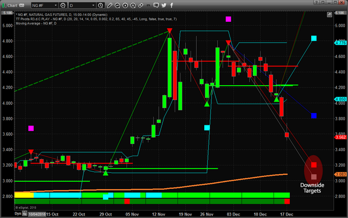 This Daily Natural Gas chart highlighting our predictive Fibonacci price modeling system shows the downside price targets that are waiting to confirm price support and a potential “deep V bottom formation”. If you recall from our earlier research, we believe this downside move will end rather quickly with a deep V type of price bottom setting up near the end of 2018. This means, we expect the price of Natural Gas to begin to rally into 2019 after reaching the $3.00~3.20 level soon.