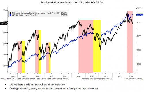 The US is still strong now, and Puplava isn’t calling for an end to the bull market yet, but we also need to note the stress in emerging markets. We may be looking at a “and then there was one, and then there were none,” scenario, with the US market being the last to roll over.