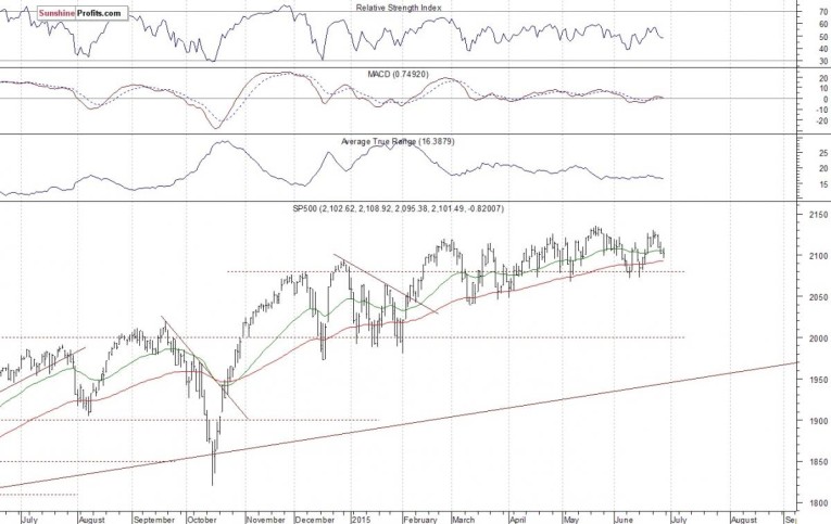 The main U.S. stock market indexes were mixed between -0.7% and +0.3% on Friday, as investors remained uncertain ahead of news concerning Greece debt crisis. The S&P 500 index trades within a short-term downtrend. The nearest important level of resistance is at around 2,115, marked by local highs. On the other hand, support level is at 2,070-2,080, among others. There have been no confirmed negative signals so far. However, we can see negative technical divergences:
