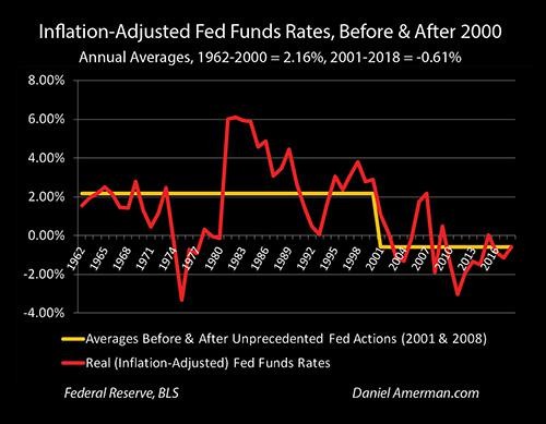 In each case a cycle of crisis was followed by a cycle of the containment of crisis, which involved extraordinary interventions by the Federal Reserve. The Fed forced inflation-adjusted interest rates to the irrational place of being negative for 12 of the 18 years since then (annual averages), with a cumulative average inflation-adjusted interest rate for the 18 years of 2001 to 2018 being an extraordinary negative 0.60%.