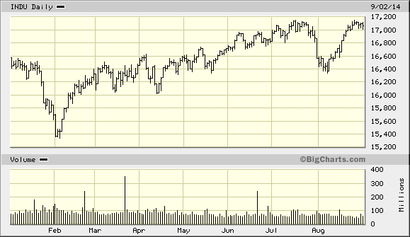 The “hard down” phase of the 10-year cycle in 2014 has produced a lateral trading range in the Russell 2000 Small Cap Index (RUT). In the Dow, however, the influence of the 10-year down cycle has been much more benign and the end result has been an upward-sloping trading range for the Dow (see chart below). The implication behind this pattern is that a secular bull market is well underway. Accordingly, the upcoming cycle bottom will likely produce higher stock prices in 2015 as a new 10-year cycle will act as a favorable tail-wind for stocks (instead of an unfavorable head-wind).