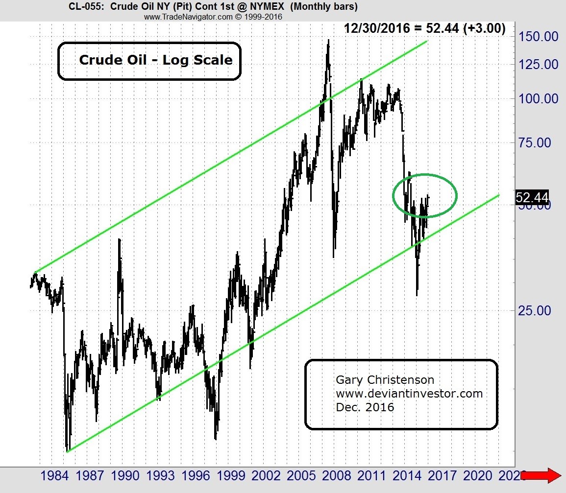 Examine this three decade chart of crude oil on a log scale. Prices increase exponentially and are near the bottom of the range as drawn.