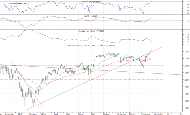 The U.S. stock market indexes gained 0.2-0.4% on Friday, extending their short-term uptrend, as investors' sentiment remained bullish following presidential elections outcome. The S&P 500 index has reached yet another new all-time high at the level of 2,213.35. The nearest important support level is at 2,190-2,200, marked by previous level of resistance. The next important level of support remains at 2,170-2,180. The market continues to trade along its medium-term upward trend line, as we can see on the daily chart:
