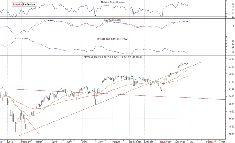 Concluding, the broad stock market broke below its short-term consolidation yesterday, as investors took profits off the table. However, the S&P 500 index remains close to 2,250 mark, while continuing to trade along its medium-term upward trend line. We still can see technical overbought conditions. Therefore, we continue to maintain our speculative short position (opened on December 14 at 2,268.35 - opening price of the S&P 500 index). Stop-loss level is at 2,330 and potential profit target is at 2,150 (S&P 500 index). You can trade S&P 500 index using futures contracts (S&P 500 futures contract - SP, E-mini S&P 500 futures contract - ES) or an ETF like the SPDR S&P 500 ETF - SPY. It is always important to set some exit price level in case some events cause the price to move in the unlikely direction. Having safety measures in place helps limit potential losses while letting the gains grow.