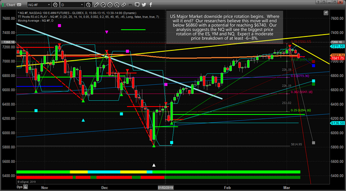 Our expectations for this move are that the NQ will see the biggest price rotation compared to the ES and YM. We expect the ES and YM to rotate downward by about -4~8% while we expect the NQ to rotate downward by -6~12%. The reason for this is that we believe investors are already in the midst of a capital shift moving capital away from technology and into Blue Chips and Mid-Caps. We believe this transition away from technology will continue and we believe this price weakness may result in the NQ/Technology establishing much lower price levels than many expect.