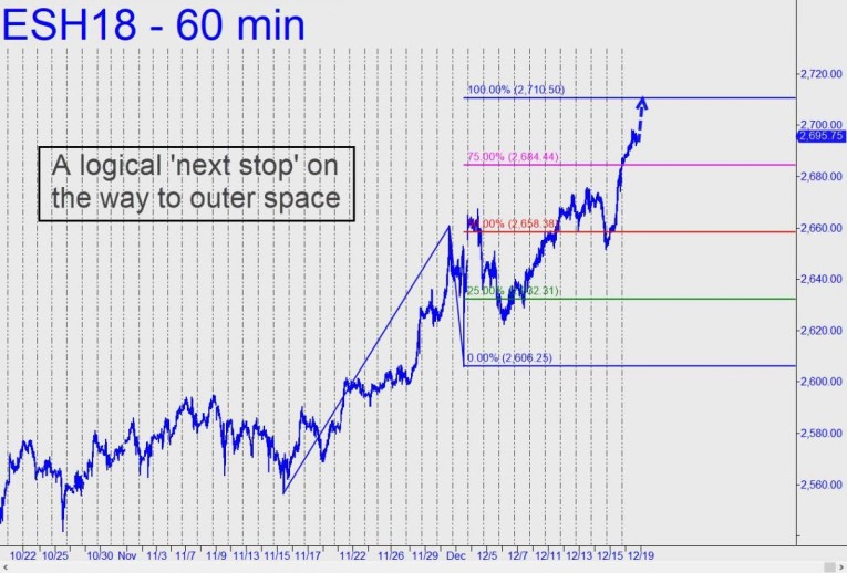 The next leg up can be expected to produce an equally precise stall at the 2710.50 target shown. Get short a single contract with a 2710.25 offer, stop 2712.25, but you can step up the size to four contracts if you’ve made money on the way to the target.