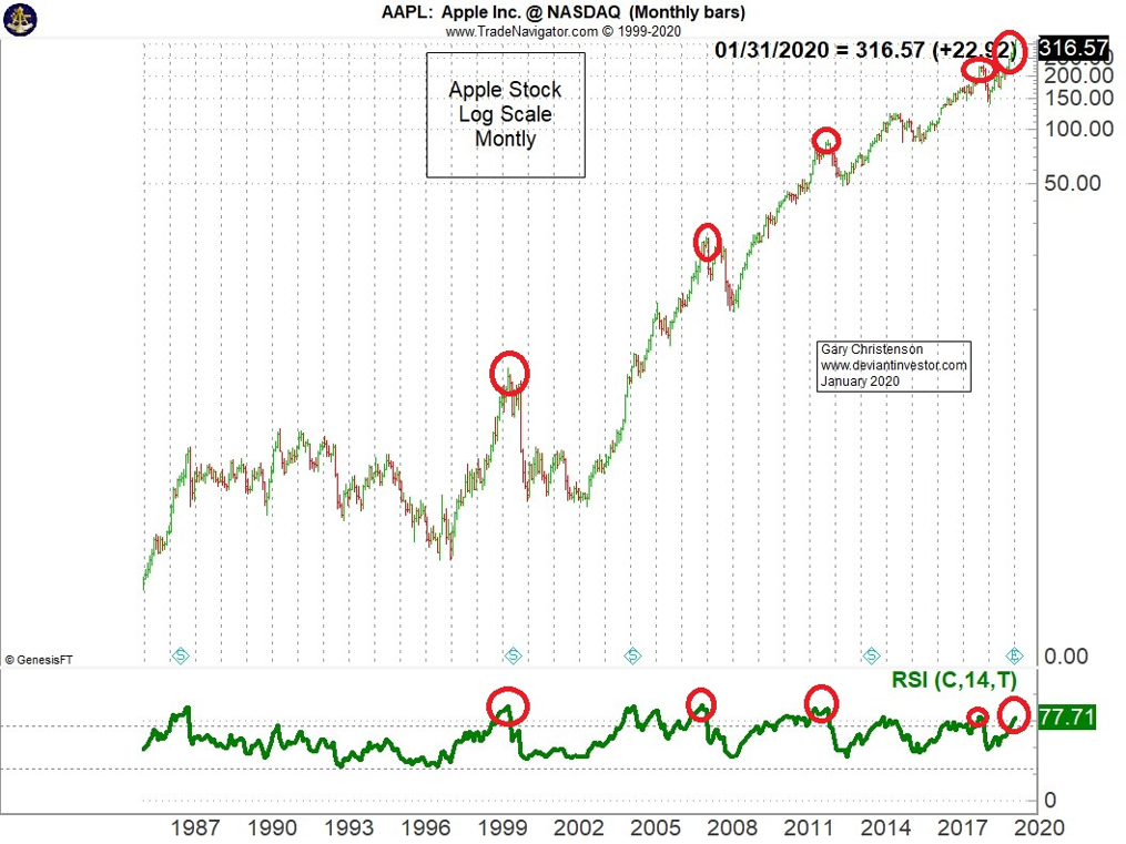 Apple stock sold for less than $1 (split-adjusted) in 1997. It traded at $315 in January. Microsoft stock sold for less than $2 in 1993. It traded at $166 in January. By most measures both stocks are too high, over-bought, over-valued and priced to perfection. Regardless, they can rise higher.