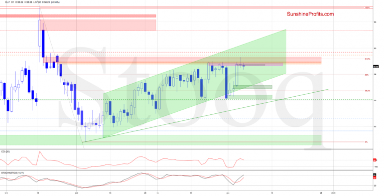 Summing up, Wednesday’s oil upswing generated no follow-through buying as the bulls haven’t yet again overcome the strong combination of resistances ahead. It’s the 61.8% Fibonacci retracement, and the three gaps (pink, red and orange ones), now also supported by yesterday’s grey gap. They have reliably stopped the bulls several times already, and the short position thus remains justified.