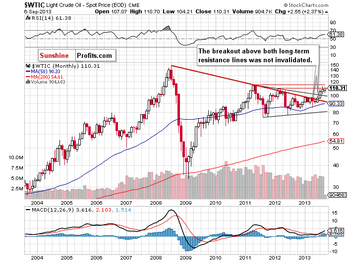 (…) light crude still remains above the two long-term declining resistance lines: one of them (bold red line) is based on the July 2008 and the May 2011 highs, and the second one is based on the September 2012 and March 2013 highs (the upper black line).
