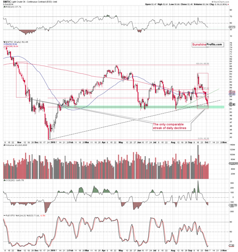 That’s based on the price moves. Now, considering the aspect of time, we get another indication that at least a brief turnaround is likely. Crude oil has been declining relentlessly for the past 7 trading days. There was no similar case when that happened in 2019. The most recent similar case is when crude oil declined in the fourth quarter of 2018. Interestingly, it happened at relatively similar price levels. The red rectangles that we used to mark the above are identical. If crude oil declines to $51 here, the size of the relentless declines will be practically identical. And history tends to rhyme.