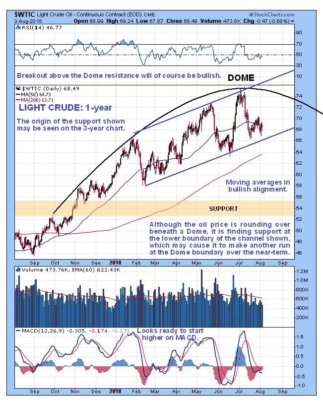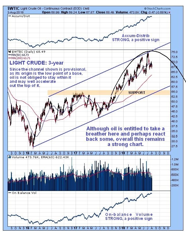On the latest 1-year chart for Light Crude we can see that the reaction back during the 1st half of July was nothing out of the ordinary, and it has brought the oil price back down to support near to the lower boundary of the intermediate uptrend shown, which is expected to turn the price back up again, especially as moving averages are still in quite strongly bullish alignment and the earlier overbought condition has fully unwound, as shown by the MACD indicator. However, on this chart we can also see a restrictive Dome pattern forming whose origins can be traced back to late last September, which may prevent the next rally getting as high as the upper return line of the uptrend channel before it turns down again, and we can get a better perspective on this Dome pattern by looking at the 3-year chart, which puts it in the context of the entire bull market advance to date from the early 2016 low, following the severe “crush Russia” bear market that preceded it and resulted in a lot of oil workers in the States being forced into idleness.