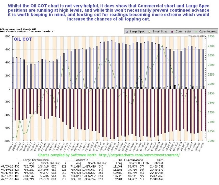 Whilst the oil COT chart is not as useful as COT charts for other commodities, because it does make anywhere near such wild swings, it does reveal that Commercial short and Large Spec long positions are at relatively high levels historically. While they are not at levels that will necessarily prevent further gains, they put us on notice that should they climb to greater extremes a deeper reaction back will become more likely. A reaction back across the channel shown on the 3-year chart below would result in these readings easing to healthier levels.