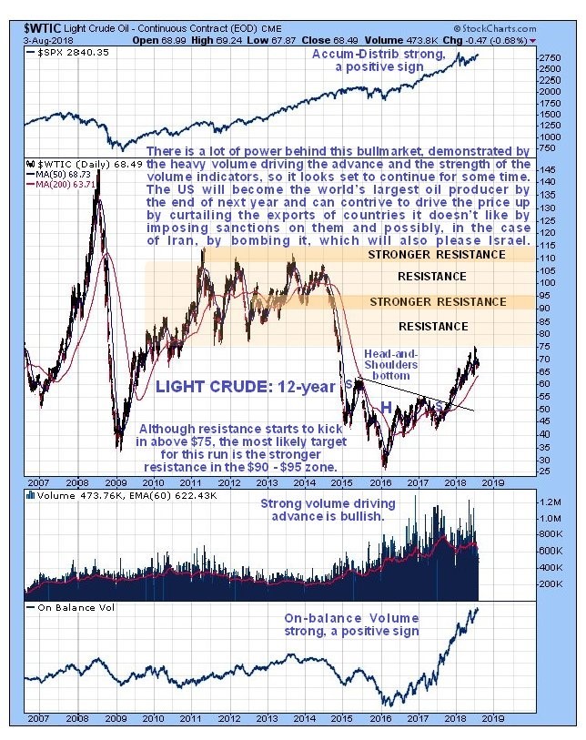 Conclusion: - Whilst a near-term rally up to the $73 - $74 area looks likely, there is a good chance that it will be followed by a deeper reaction back across the channel delineated on the 3-year chart, which might take the price back to say $58 - $60. Thereafter the price should advance anew, provided a broad-based market crash doesn’t hit, that might see oil reach the $90 - $95 area or even higher.