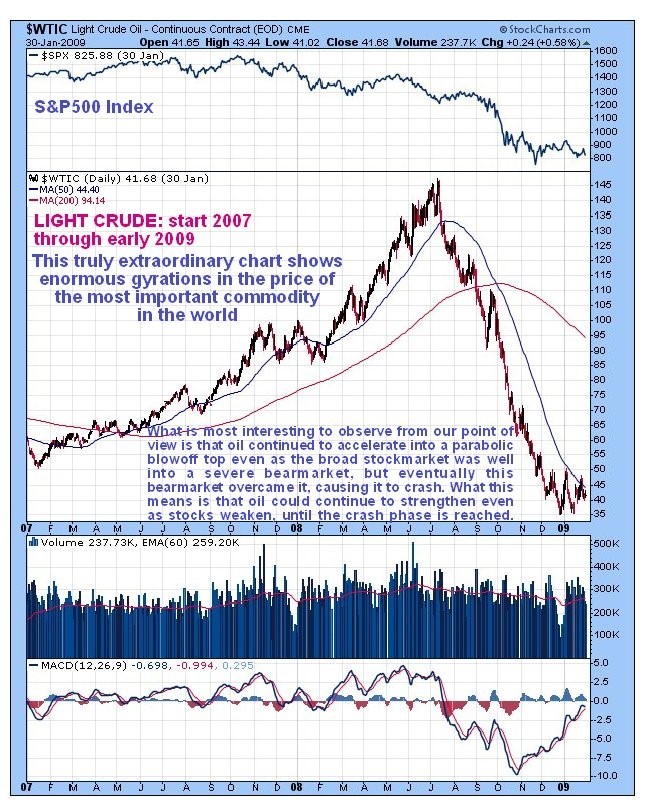 The very long-term 12-year chart gives us a most useful overall perspective. On this chart we can see the huge runup in the oil price during 2007 and early 2008 that was followed by a more dramatic selloff occasioned by the 2008 market crash. The price then made back a good portion of the losses caused by the crash, peaking again in 2011, and then chopped sideways for years before plummeting in 2014 in the “crush Russia” crash which was a concerted attempt by Saudi and the US to force Russia to the wall, which didn’t work. What it did do is cause the price to drop to even lower levels than at the trough of the 2008 - 2009 market crash, resulting in thousands of US oil workers being thrown out of work. After this severe decline to a low level a down sloping Head-and-Shoulders bottom formed which the price broke out of into a new bull market just last Fall. Going just on price alone this new bull market looks rather anemic and like it may peter out and reverse into another bear market before much longer, and while we can expect this to happen if we see another 2008 meltdown, the heavy volume driving this advance and the resulting strong volume indicators suggest that there is a lot of power behind this bull market, which could take the oil price a lot higher if the general market crash that threatens holds off for long enough. With respect to this, it is now worth looking in some detail at how the oil price was influenced by the 2007 – 2009 general market crash, which we can do by looking at a chart for this timeframe with the S&P500 index added to it.