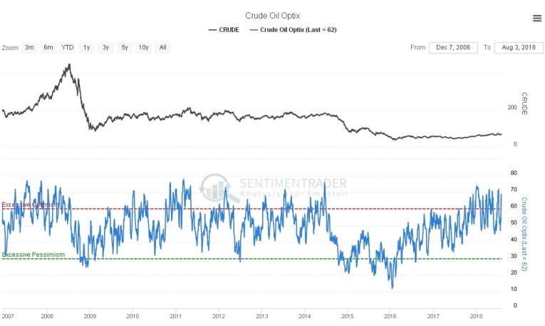 Finally, the Crude Oil Optix, or optimism chart, shows that optimism is at the sort of levels that frequently lead to a significant reaction, and the look of this chart suggests a higher chance that Light Crude will react back across the larger channel shown on our 3-year chart, probably after 1st rallying up towards the Dome boundary.