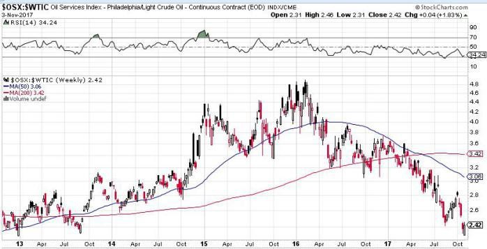 Take a well for which the all-in costs are around $40 a barrel. If the price is $50 a barrel, then the company earns $10 profit per barrel. If the price goes up to $55 a barrel (as $WTIC is today), then this 10% rise in price has produced a 50% jump in profit. That’s some leverage. Since stock prices fundamentally are tied to profit, then oil stock prices also are leveraged to the price of oil. Today, compared to the price of oil, the price of the oil stocks is around as low as it’s been over the last 5 years.