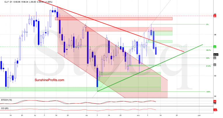 Earlier today, crude oil futures opened the day with the green gap, which triggered further improvement and another test of the red gap. While this is a positive development for the bulls, as long as the above-mentioned resistances remain unbeaten, another bigger move to the upside is questionable. This is especially the case when we factor in the 76.8% and 78.6% Fibonacci retracements based on the mid-July-August downward move, which reinforce the area around the late-July peak.