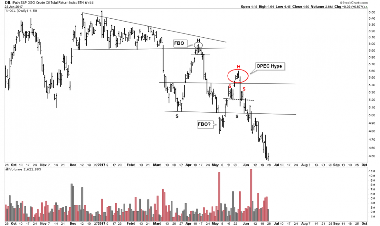 Looking at the chart above I have described it as a super-ball bouncing down the stairs. When a ball is rolled down the stairs the amplitude of the bounces increase with each progressive bounce. The reason for this of course is potential energy is being converted into kinetic energy. We see this dynamic in the chart above. This is not just a coincident metaphor, but a market principle in energy dynamics. Recall how the oil price stayed in a bounded channel for 24 years between $10-$40 from 1980-2004. During that time it was coiling energy so when it finally broke out it had the propulsive power to run to $147 over the next 3 years. These physical dynamic images are useful in understanding markets. So what that means for us now is this market still has downward energy in it. The second bounce we saw occurring in the month of May was strictly based on OPEC-hype narrative. It immediately fell apart after the OPEC meeting.